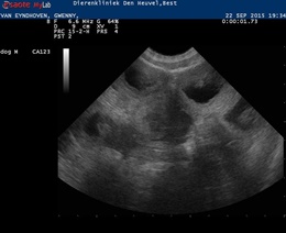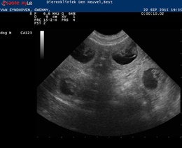 22 September 2015 | And then it is time for the ultrasound. We have great news. She is very very very pregnant! We saw a lot of puppies!! She already showed some signs of pregnancy but still it is always exciting to see if the ultrasound confirms our feeling. Puppies are expected due 17 October 2015 . Her weight 17,8 kg. Below you van see two pictures of the ultrasound: